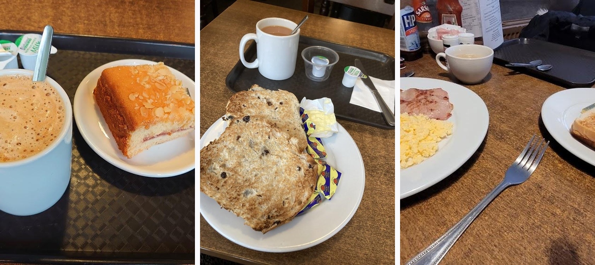 I had a mug of tea and toasted currant teacake. It was superb. Tasty, fresh and hot. Plenty of butter to fully coat the teacake.